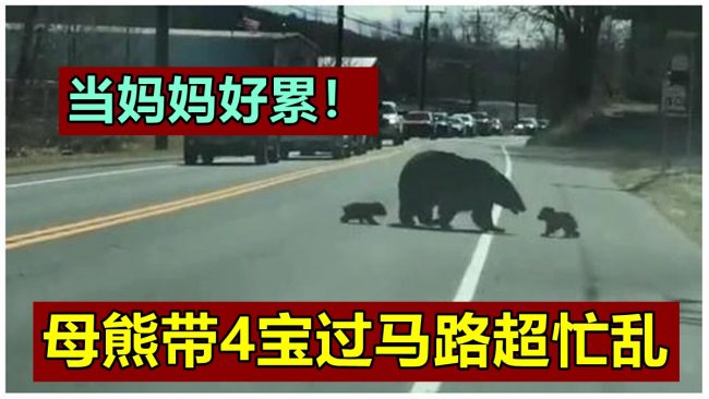 (康涅狄格1日综合电)美国康涅狄格州近日一段熊妈一拖四过马路的短片,许多人类妈妈都感同身受。 据报,这段短片摄…