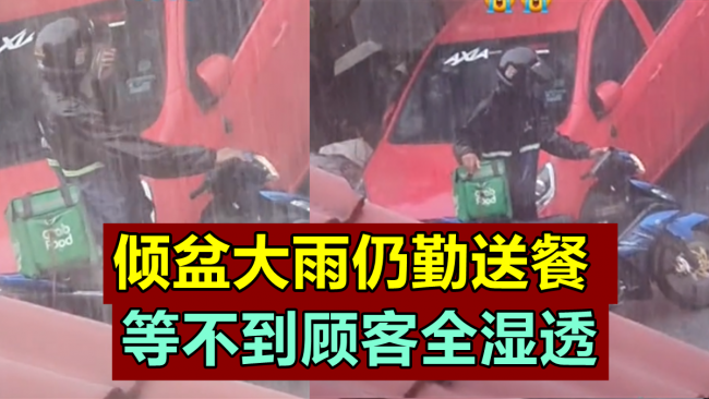倾盆大雨仍勤送餐 等不到顾客全湿透